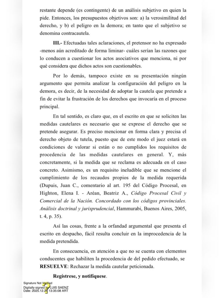 «Estoy muy tranquilo porque nosotros presentamos el jueves pasado la impugnación del acta de Comisión Directiva del martes 16 de diciembre así que estamos esperando el fallo del juzgado 51 civil que va a salir seguramente mañana y bueno va a quedar la Asamblea que se vivió ayer nula», declaró Marcelo Moretti esta mañana en «Picado TV». Sin embargo, hace minutos el ex vocal Marcelo Culotta confirmó mediante su cuenta de X, que el Juzgado Civil N°51 rechazó el recurso presentado por Moretti, quien en consecuencia con este revés judicial finaliza su mandato en el club.